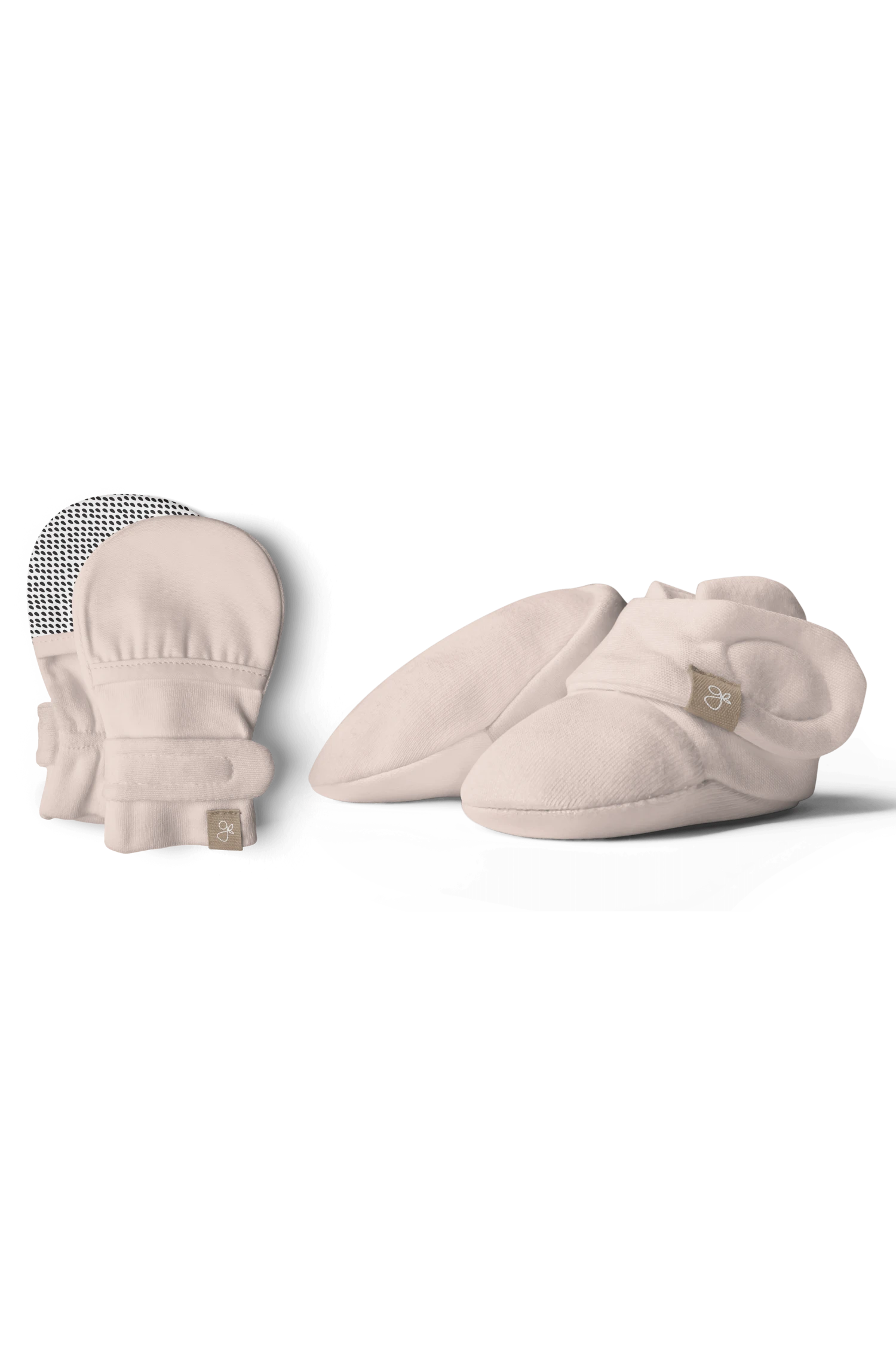 A super-soft baby boot and mitt duo that are adjustable and stay on, no matter what!